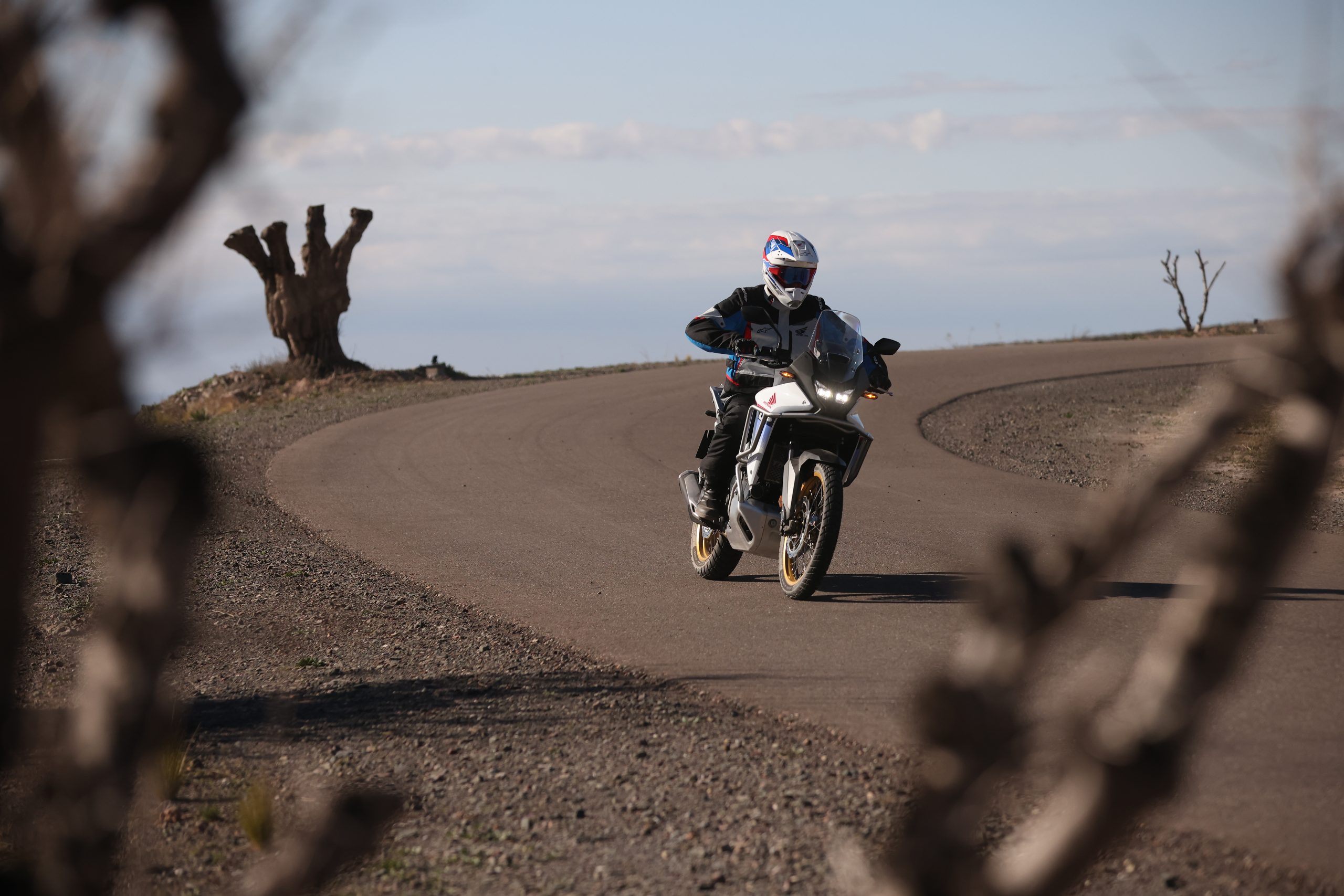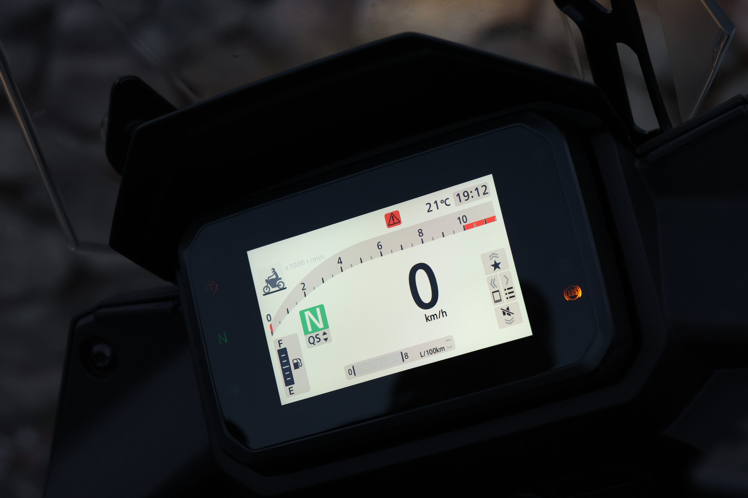 El tanque de 16,9 litros brinda autonomía para largas travesías, mientras que el parabrisas, fabricado en Durabio, refuerza el compromiso de la marca con materiales sostenibles y respetuosos con el ambiente. El tablero TFT de 5 pulgadas ofrece una lectura clara y precisa de la información incluso en condiciones de luz exigentes. Su doble faro proyector LED, inspirado en la Africa Twin, garantiza una excelente visibilidad nocturna. La suspensión delantera está compuesta por una horquilla invertida Showa SFF-CA con 200 mm de recorrido. El sistema de frenos incluye doble disco delanterode 310 mm con pinzas Nissin de dos pistones, que ofrecen gran precisión y respuesta.