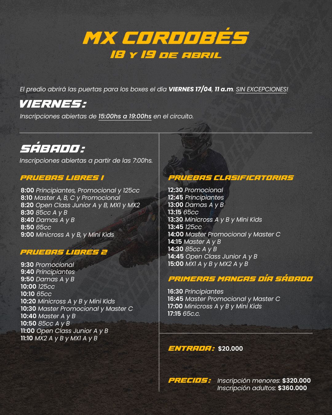Para tener todo ordenado y que uds. sepan cuando inscribirse, ingresar a la pista o cuando puedan descansar, aquí les dejamos los horarios COMPLETOS para Laboulaye, sede de la 2da. fecha del MX CORDOBÉS! Será una carrera impresionante donde VOS piloto, volverás a ser parte del MAS GRANDE!