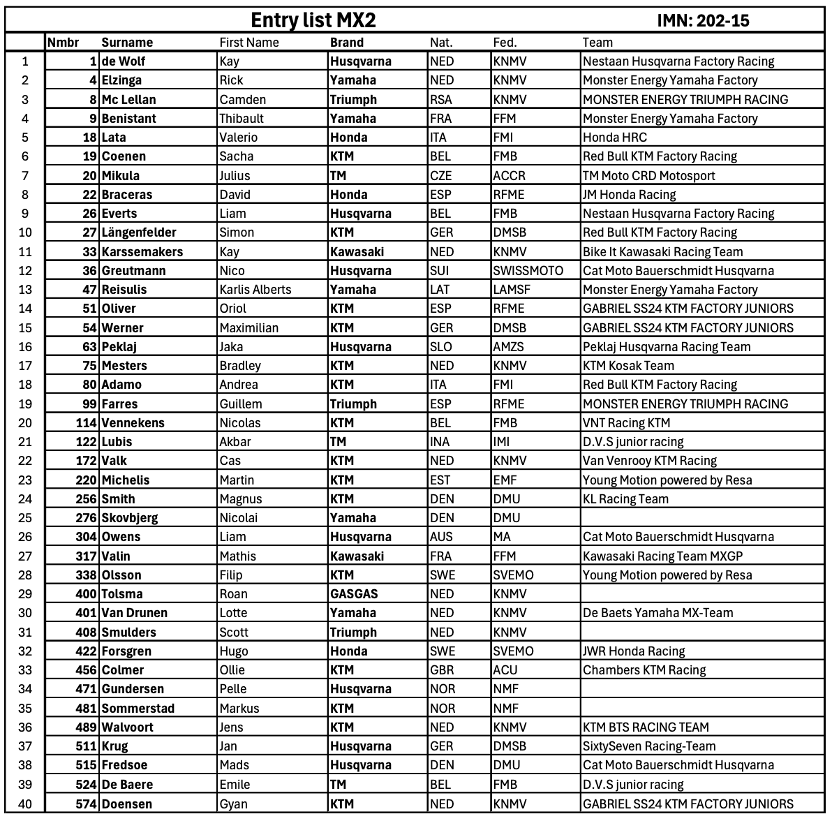 MX2 – World Championship Top 10 Classification: 1. Simon Längenfelder (GER, KTM), 665 Points; 2. Andrea Adamo (ITA, KTM), 618 Pts;  3. Kay de Wolf (NED, HUS), 606 Pts; 4. Sacha Coenen (BEL, KTM), 520 Pts; 5. Thibault Benistant (FRA, YAM), 492 Pts; 6. Liam Everts (BEL, HUS), 464 Pts; 7. Camden McLellan (RSA, TRI), 417 Pts; 8. Valerio Lata (ITA, HON), 330 Pts; 9. Guillem Farres (ESP, TRI), 306 Pts; 10. Cas Valk (NED, KTM), 299 Pts.
