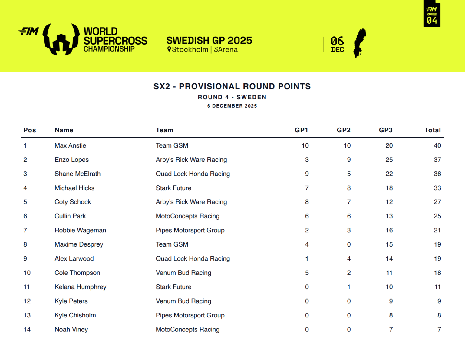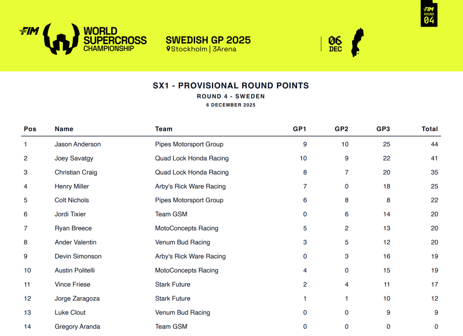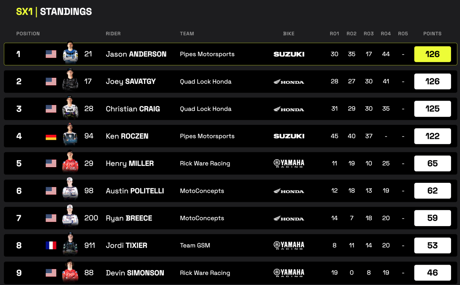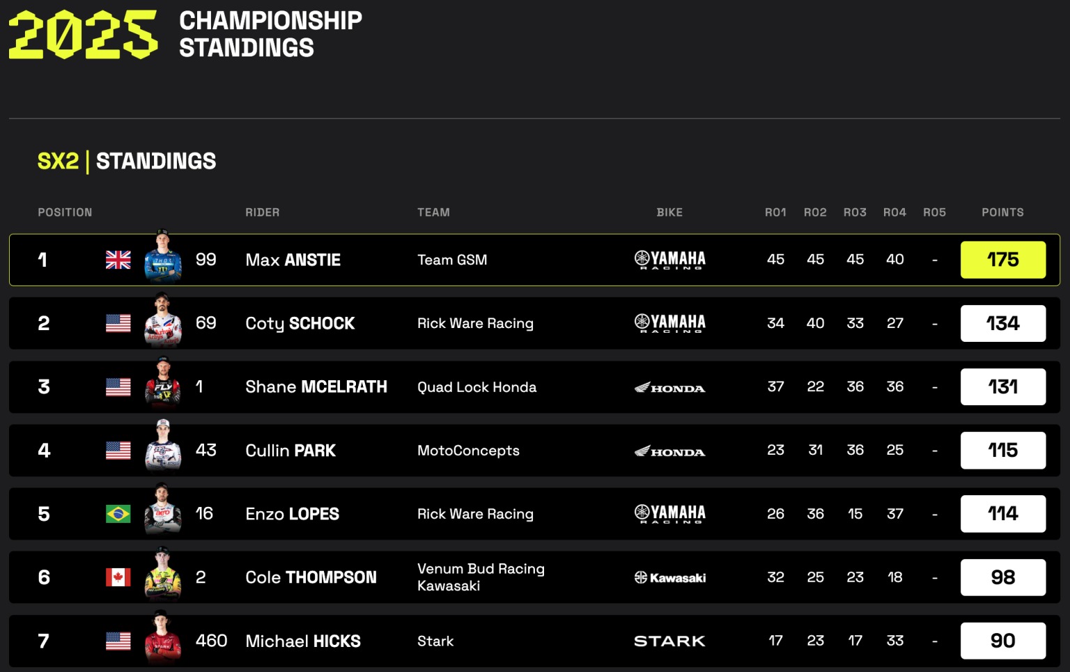 4ta. fecha del año para este singular campeonato que tiene en SX2 a Max Anstie como ganador en esta carrera y candidato a la corona. Respecto de SX1, en Argentina no lo vimos brillar como lo hace ahora sobre la Suzuki y nos referimos a Jason Anderson que con mucha firmeza, lidera en los puntos.