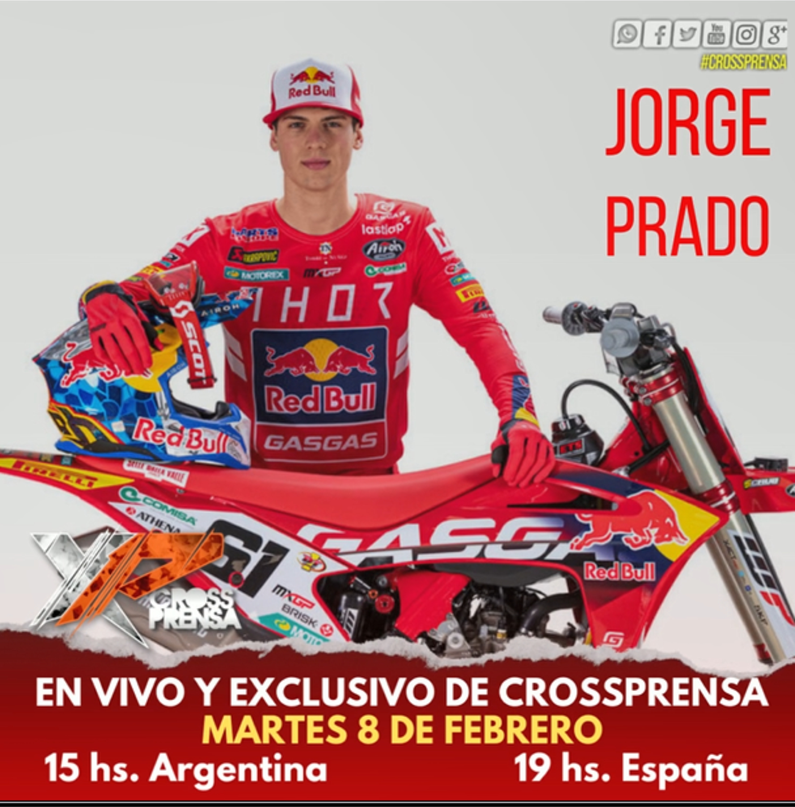 El piloto español campeón del Mundo de MX2 en 2018 y 2019, hará su debut esta temporada sobre la Gas Gas 450, sobre la que lo veremos en Argentina 19 y 20 de Marzo en Villa La Angostura. Ahora, podemos anunciar que Jorge estará EN VIVO en Crossprensa!