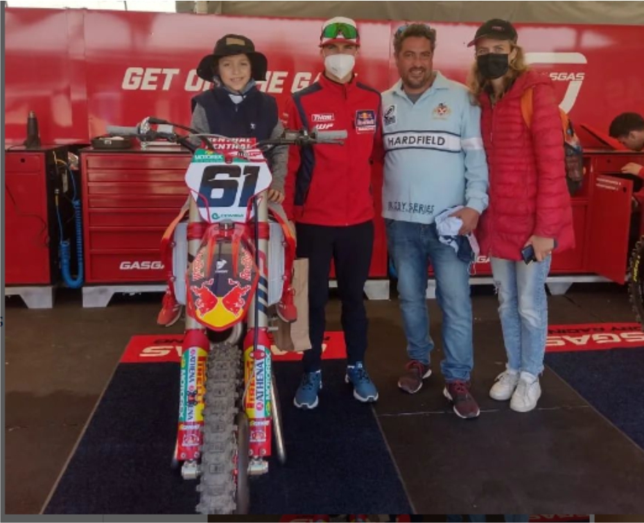 Que Jorge Prado -Piloto de GasGas- y Tim Gajser se interesaran por su historia, le hicieran regalos en el Mundial de 2022 en Argentina, que visitara sus boxes y recibiera esas palabras fue una inyección de entusiasmo, de pilas, de ganas de VIDA que no se cuanto pudo haber servido para llegar hasta acá, pero si tengo la felicidad de haber podido contribuír con él como lo haríamos (e hicimos) con cualquiera que nos lo pidiera, porque mi amistad con Jorge o con Tim si la usé para que él cumpla su sueño.